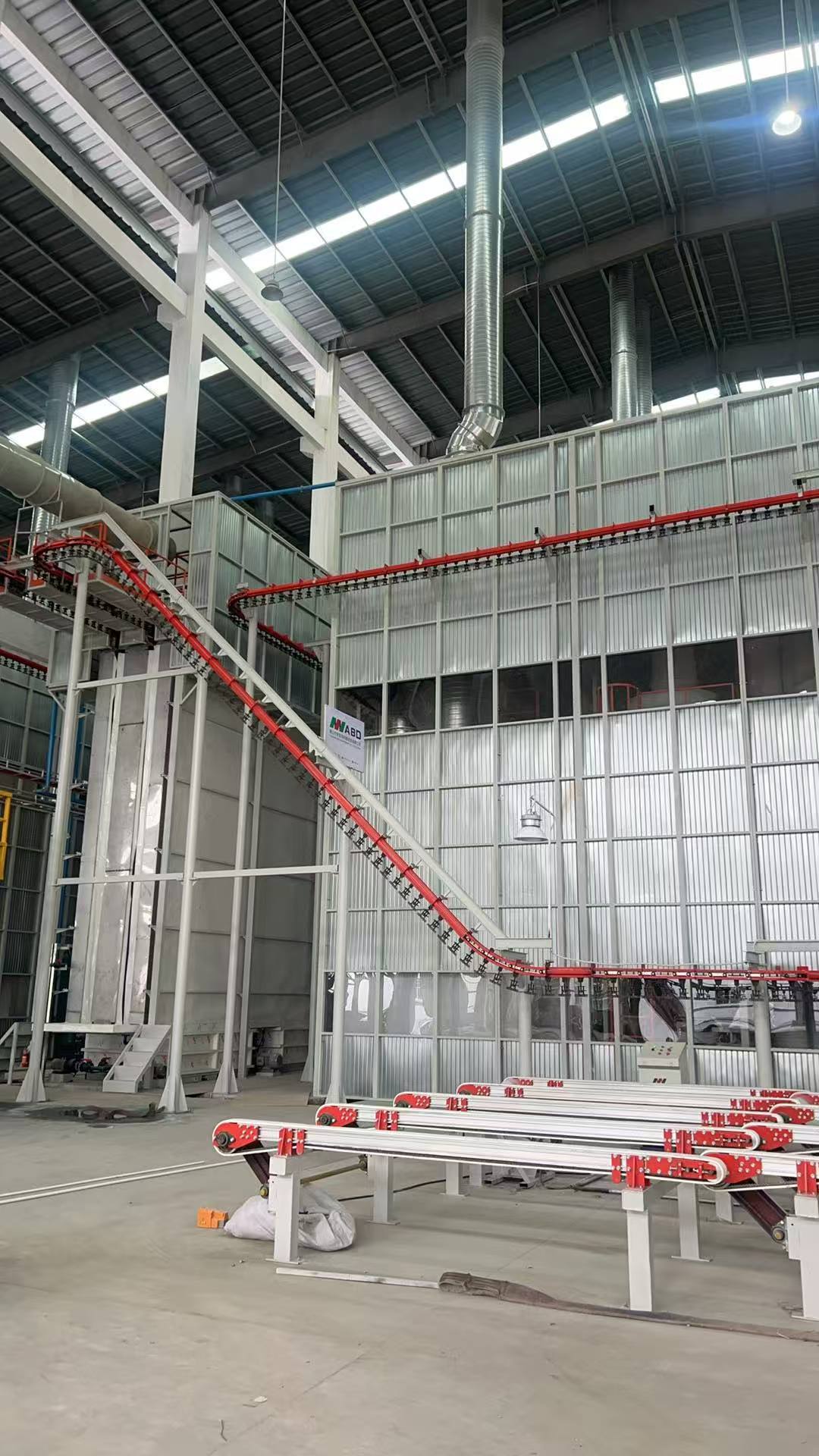 Hoofdcomponent:Poedercoating Hangend transportersysteem,laad- en lossysteem,voorbehandeling,drogende oven,poedercoatingkamer en recycling systeem,verhardingsoven,elektrisch besturingssysteem,poedercoatingskanonnen,Poedervoorziening- Luchtcompressor, watermachine, enzovoort.
